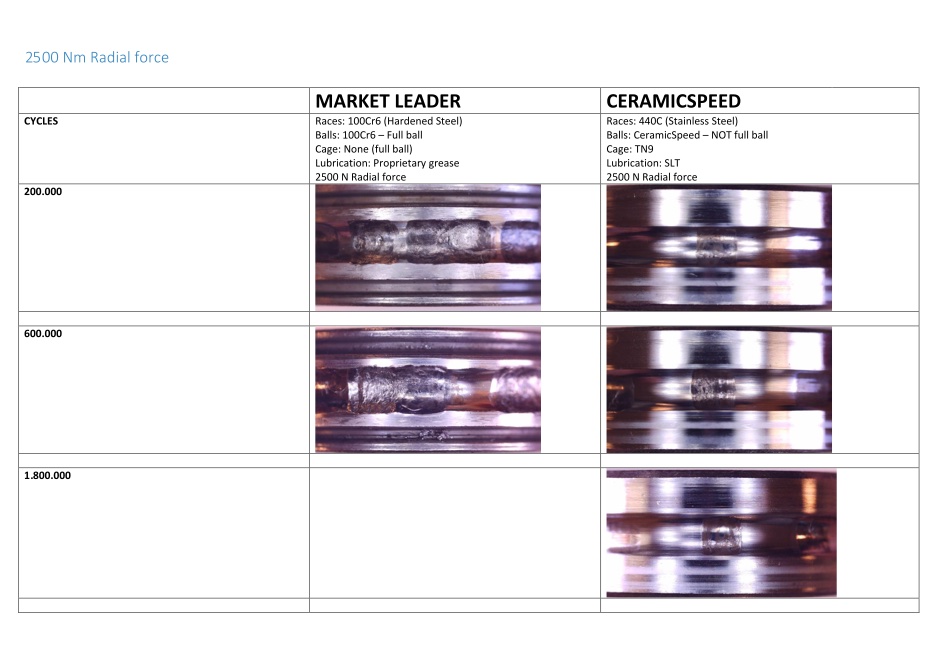 Having concluded the most recent round of longevity testing, CeramicSpeed SLT Bearings have outperformed the market leader for off-road pivot bearings, by as much as three times. Testing results, performed with 2500Nm of radial force, show the extraordinary differences in wear between CeramicSpeed SLT Bearings after 1.8 million cycles and a market leader at 600,000.