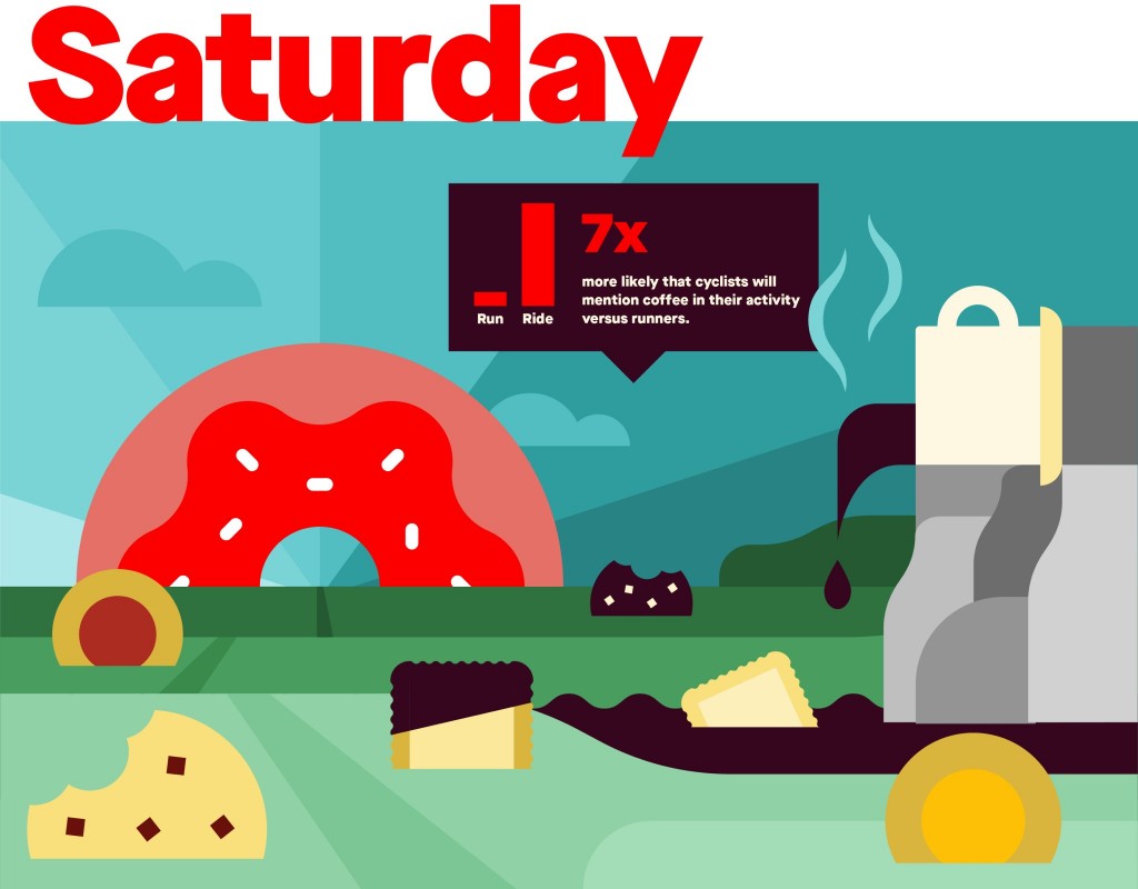 Cyclists love coffee! They are more than 7x more likely to mention coffee in their activity title than runners.