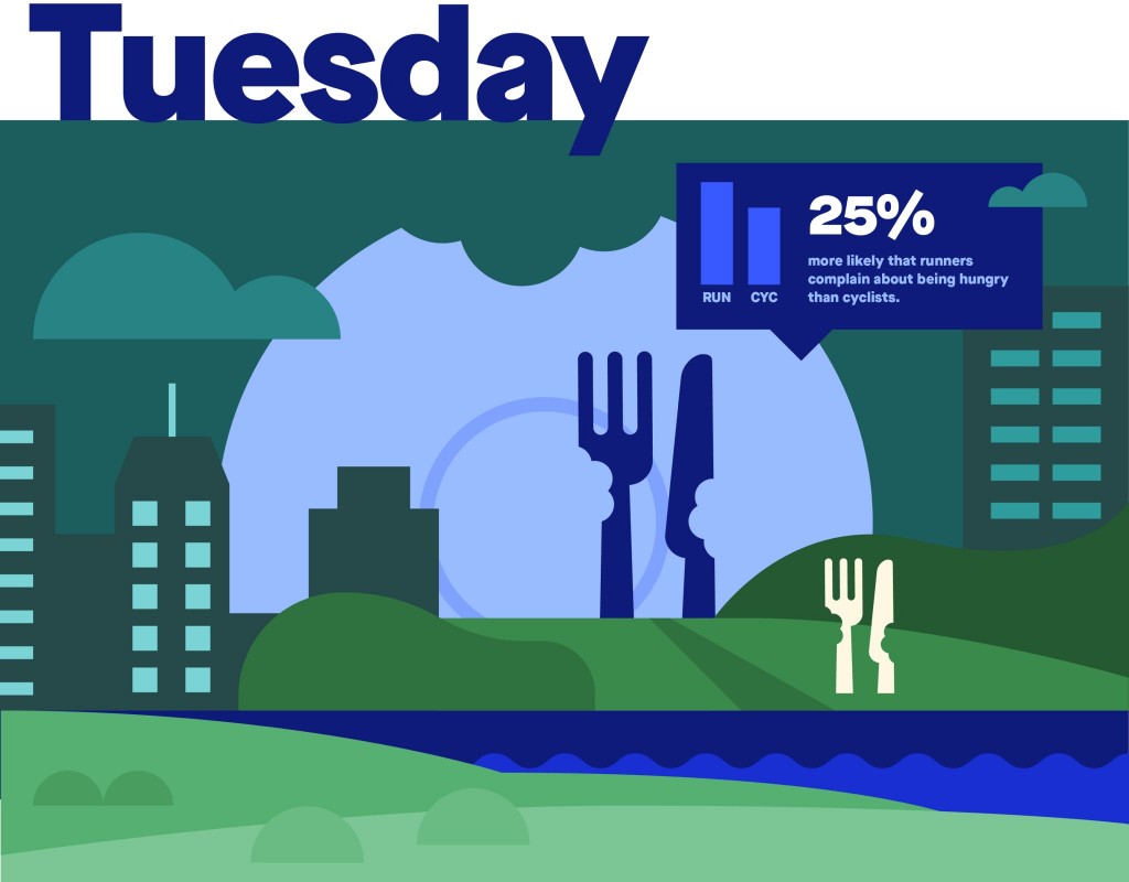 On Tuesdays, athletes are hungry! There are more mentions of hunger on Tuesdays than any other day of the week. And, although cyclists outperform runners when it comes to mentioning food and drink in their activity titles, runners are almost 25% more likely to complain about being hungry than cyclists. It seems runners, perhaps unsurprisingly, aren’t often stopping to eat or drink. Maybe it’s time to start introducing mid-run cafe stops to keep those hunger pangs at bay!