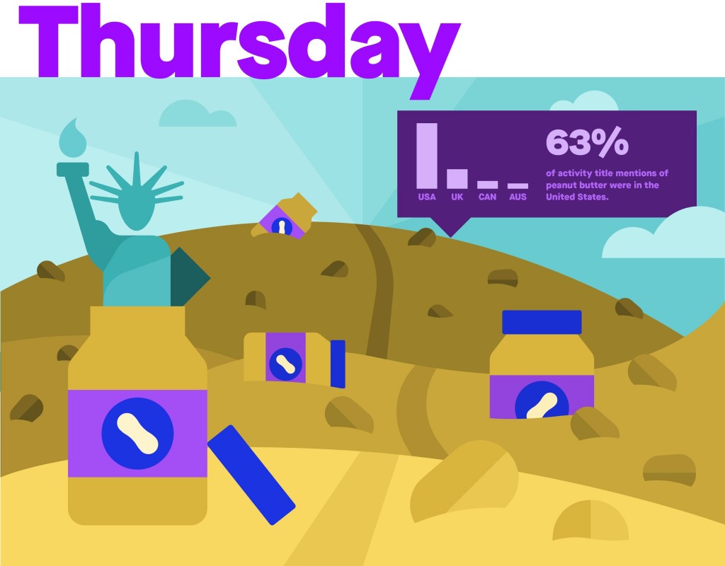 Thursdays are the day Strava athletes turn to peanut butter to keep them fueled. Surprisingly, peanut butter isn’t that popular on Strava – although our US athletes love it, the rest of the world aren’t such fans. 63% of activity title mentions of peanut butter were in the US. Thursday proved the most popular day of the work week for a peanut butter run, ride or swim. It seems by Thursday athletes are running out of lunchtime inspiration!