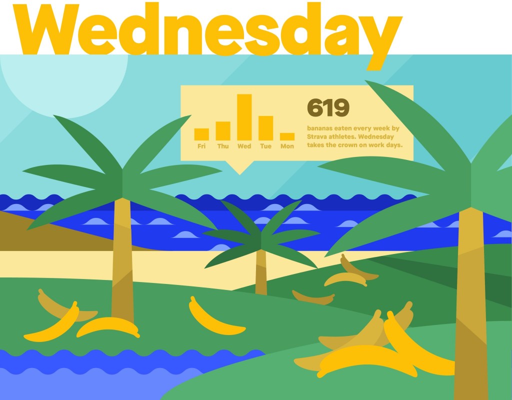 Bananas are every athlete’s best friend. In a single week, Strava athletes munched their way through 619 bananas. Saturdays are the most popular banana-eating day, but when it comes to the work week, Wednesdays take the crown. We estimate by midweek, 80% of those bananas are starting to look a bit brown!