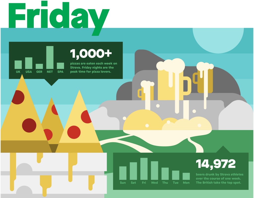Pizza is the second most popular food on Strava, squeezing in between cake and burgers on the leaderboard. Over 1,000 pizzas are eaten each week on Strava, with Friday taking the pizza consumption KOM. It seems pizza and beer really are a match made in heaven.