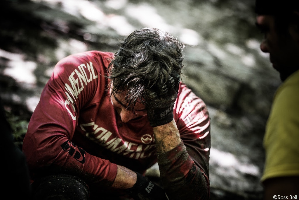 Here’s what happened: after sliding down a massive rock, face first, he sat for a long while next to the track, trying to get his mind together after such a big shock. His fingers, elbows, and torso were all bruised and scratched. At this point, we didn’t know if he’d be up in the start gate at all that afternoon.