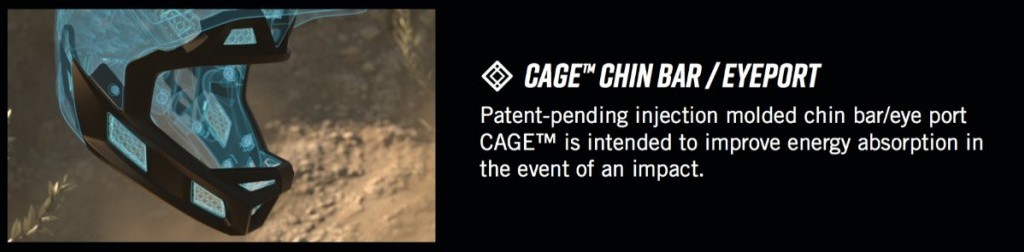 Patent-pending injection moulded chin bar/eye port CAGE is intended to improve energy absorption in the event of an impact and optimizes airflow to the rider.
