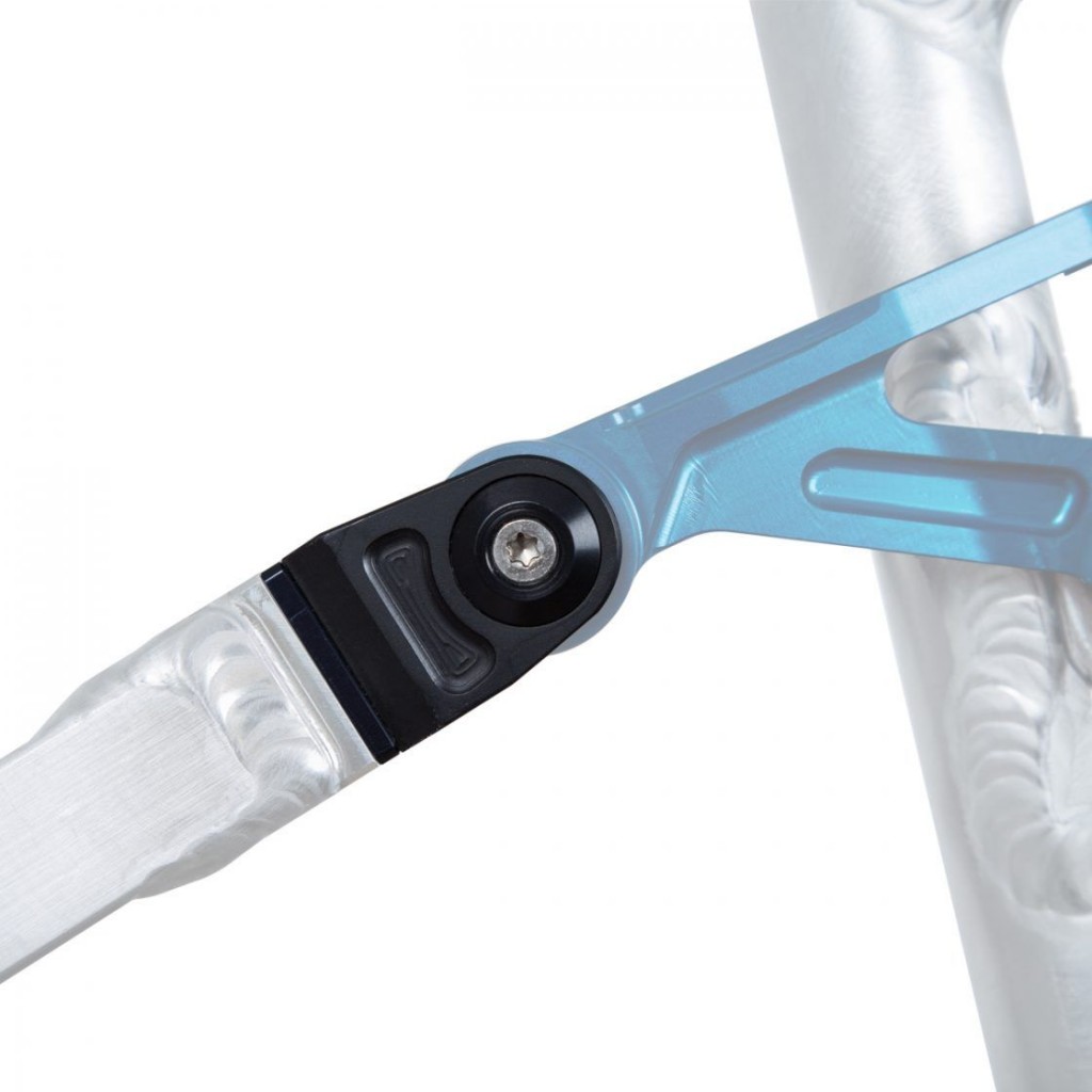 Wondering what that black thing is hidden behind the shock and seat-tube ? Every iteration of the Saturn since 2004 has featured a tension bar. This is an extra connection between the lower shock bolt and the rocker link pivot, why? When the suspension bottoms out at full compression, forces continue to try and move these pivot points away from each other (you can see many frames break around this area). The tension bar resists this and keeps the maximum forces in check, meaning that lighter tubing and machined parts can be used in this area to reduce overall weight.
