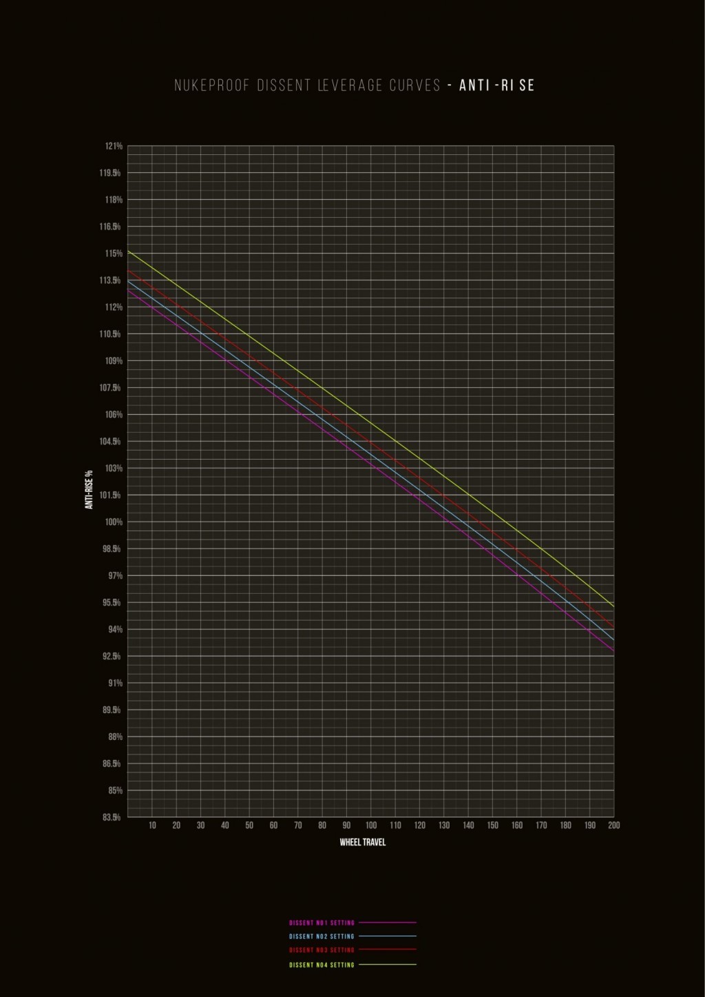 Around 100% – A balanced amount of Anti-rise to allow some squat when braking hard into a corner to maintain rider position whilst still offering a good amount of pressure through the tyre into the ground and ensure traction under hard braking.