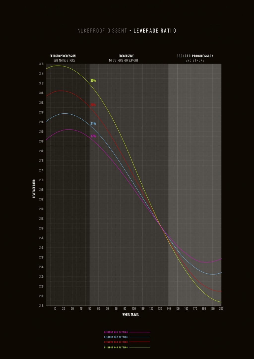 Position 4. 30% Progression – It starts with the most progressive rate off the top (Most supple over small bumps), has the least mid stroke support but then ramps up the most at the end. This is the setting that we would use for riding a bike park with loads of braking bumps and massive jumps/drops.