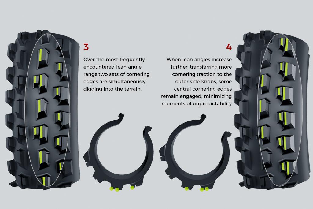 When it comes to cornering, two cornering edges are better than one. Current designs rely primarily on the side knobs for cornering, which work best only when lean angles go above a particular range. However, considering that gaining cornering edge engagement as soon as you enter the corner is always beneficial, we created a tread that grabs early and keeps holding over a broader range of lean angles.