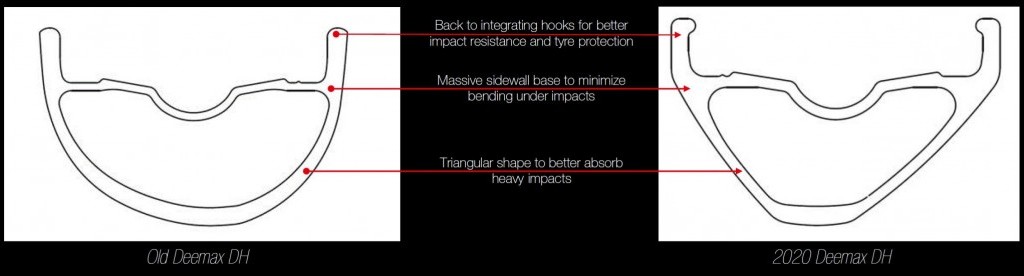 With this in mind, Mavic have completely redesigned the Deemax rim. As you can see from the side by side cutaway below, the new rim is more angular in design which helps the rim deal with sharper, heavier impacts better than before. Interesting to note that Mavic have moved back to hooks on the rim to help better seat the tyre, with Mavic claiming this also helps reduce punctures and improves tyre protection