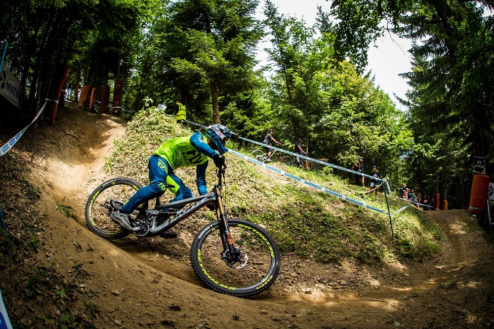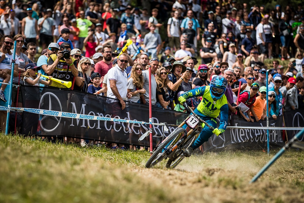 Eddie set off fast and, as usual, was up on the first split times. Pushing hard and drifting around the open, grass corners, Eddie came into the packed finish area surrounded by fans. He crossed the line in 5th, happy with a loose run and getting up to speed on the downhill bike. Eventually finishing 11th, Eddie continues his good run of results and maintains his top-20 position in the overall World Cup standings, despite missing a round.
