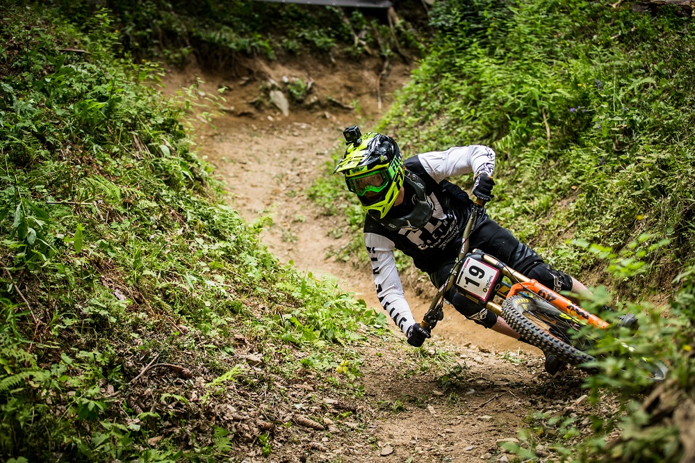 Eddie was up to speed on his downhill bike and loving the grass corners. A loose run and a few mistakes cost him some time, but qualifying in 19th shows how quickly he adapted from the Enduro race mindset to the downhill mindset.