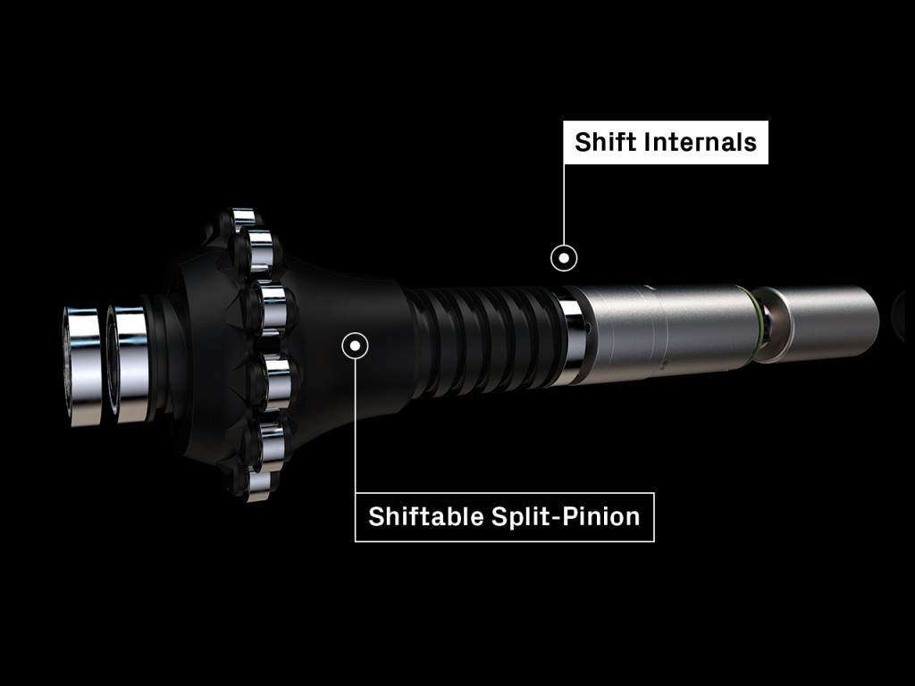 “The rear split-pinion is a novel method of changing gears, even under rider load. The pinion is split down the middle, in an axial manner, creating two halves. Each half of the pinion can move independently to complete a shift. The pinion doesn’t have to ‘wait’ for a radially aligned shift channel to arrive. With the use of the self-aligning Torque Decoupler, the pinion can shift anywhere on the rear cog. A shift occurs very quickly, within one rotation of the driveshaft. With this rear split-pinion, shift speed has the potential to outperform a traditional electronic drivetrain.”