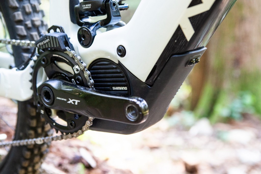 In order to make space for a full capacity water bottle on every available frame size, and room for the optional range extender battery without compromising standover clearance, Norco’s engineers devised a special shock mount adaptor and offset rocker link that mounts the coil-sprung piggyback shock off center and rotated 90 degrees in the frame.