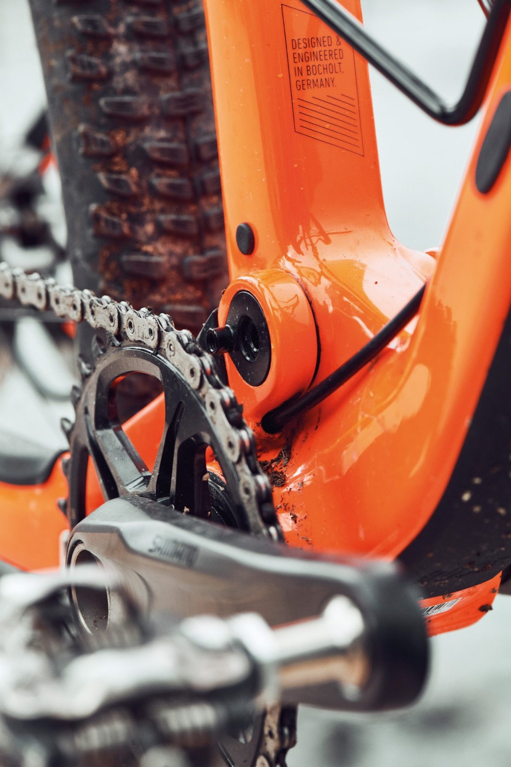 The carbon frame weighs a mere 1800 grams and impresses with clean, minimalist design. Internal cable routing reduces visible cables and hoses to a minimum. Another highlight is a flex in the seat stays. This eliminates the need for an additional joint, which saves weight and maintenance efforts. All existing joints use durable Enduro ball bearings.