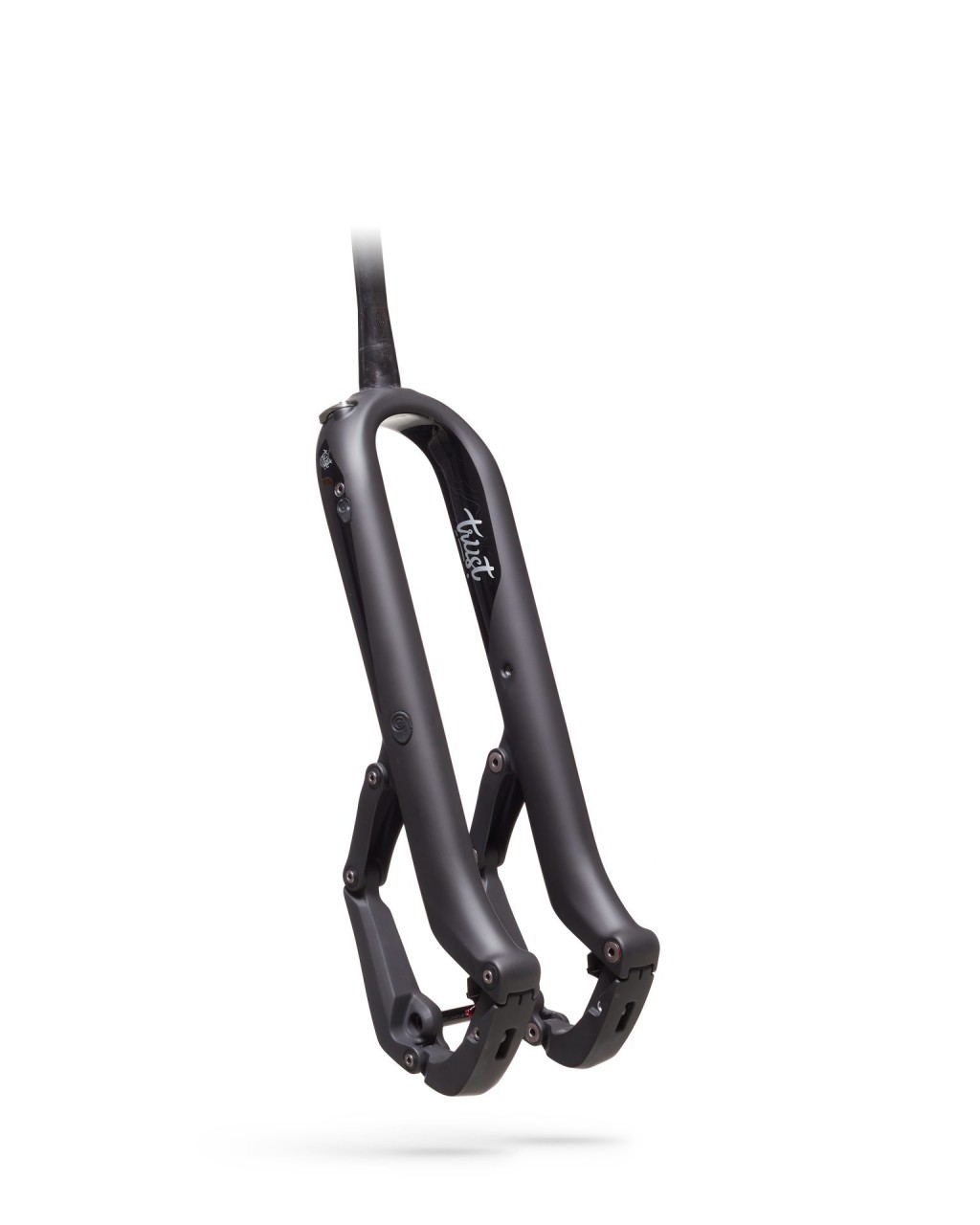 Trust Performance, innovators in suspension technology, today announced the launch of Shout, a new trailing multi-link front suspension platform for 29” and 27.5” aggressive trail and enduro mountain bikes. Shout delivers 178mm of contour travel through a twin-tube thru-shaft damper and a trailing linkage assembly that allows the front wheel to move back and away from impacts simultaneously. With a structurally stiff carbon chassis and minimal stiction, Shout greatly improves front-end traction and preserves handling for a more stable, controlled ride. Trust Performance’s Shout is available starting September 16, 2019, from authorized retailers worldwide and also at http://www.trustperformance.com for $1975.