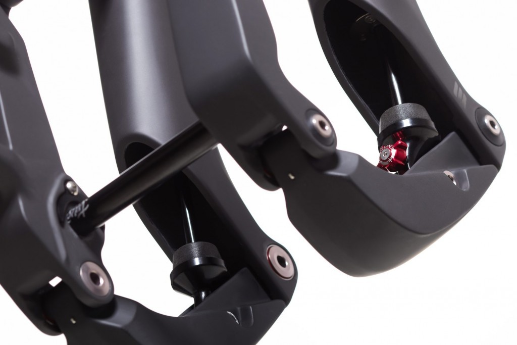 The key performance characteristics in both Message and Shout stem from Trust’s trailing multi-link design. By employing a linkage system, Trust Performance suspension reap the benefits of a leverage ratio—something typically only found in rear suspension bikes. A leverage ratio allows Trust Performance engineers to make incremental adjustments to leverage rates and fine-tune the suspension through its total range of travel. The linkage platform also separates the function of the chassis and damper, meaning the steerer-tube, crown, and chassis are purpose-built for strength and stiffness, while the suspension can move freely, with minimal stiction.