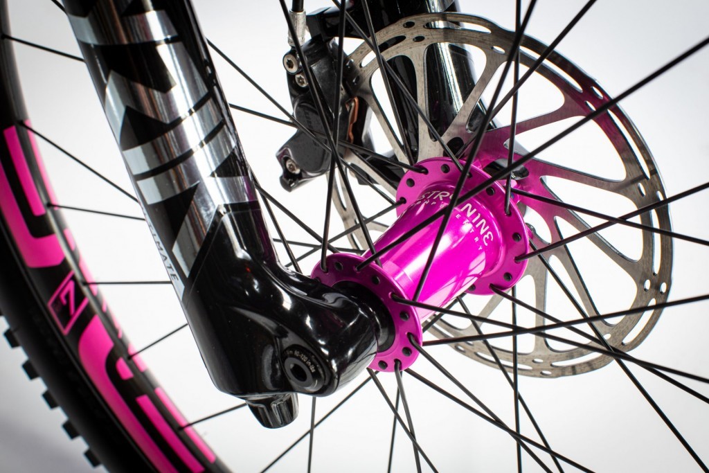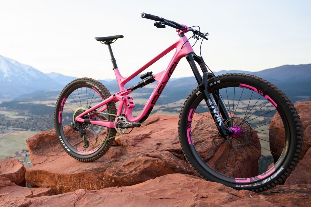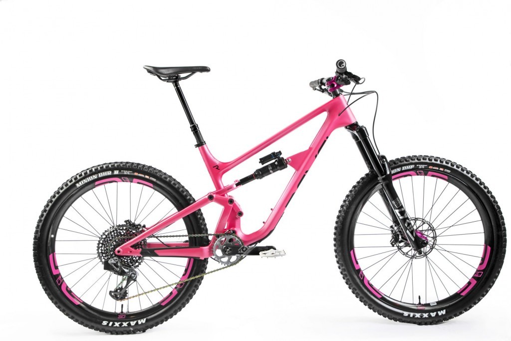 The Rail is our 165mm travel, 27.5″ wheels trail slayer. We gave it the extra special paint treatment with a gloss pink (with a hint of glitter) split with a matte pink on the bottom half of the frame. The complete bike is decked out with parts from all of our friends. Including SRAM AXS drivetrain and Rock Shox suspension. ENVE Rims are paired with Industry 9 Hydra hubs. Rubber from Maxxis and much more.