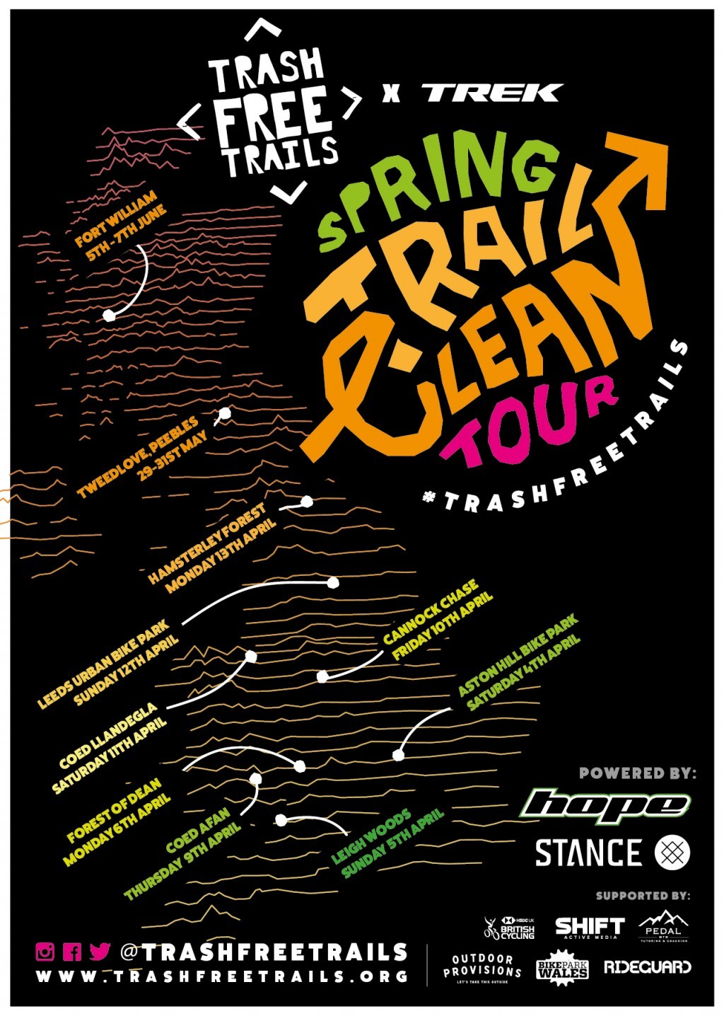 This year Spring Trail Clean Tour founding partners, Trek Bicycles UK, Stance, BikePark Wales and RideGuard are joined by Hope Technology, British Cycling, Pedal MTB, SHIFT Active Media and Outdoor Provisions, forming an inspiring collective of companies who have committed to leading from the front for our environment.