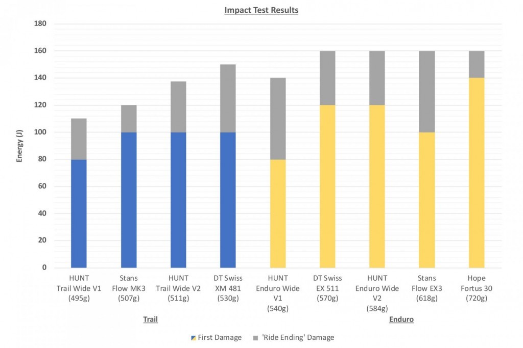 The protocol for the test results described here ensures the isolation of rim profile performance data only, by controlling other variables such as tyre, pressure, hub, and spokes used. The graph reflects two results for each rim; first the impact energy at which the initial equivalent sign of an impact is seen in the form of a visual ding, and the second being the energy at which a comparable ding would likely render a wheel unrideable.