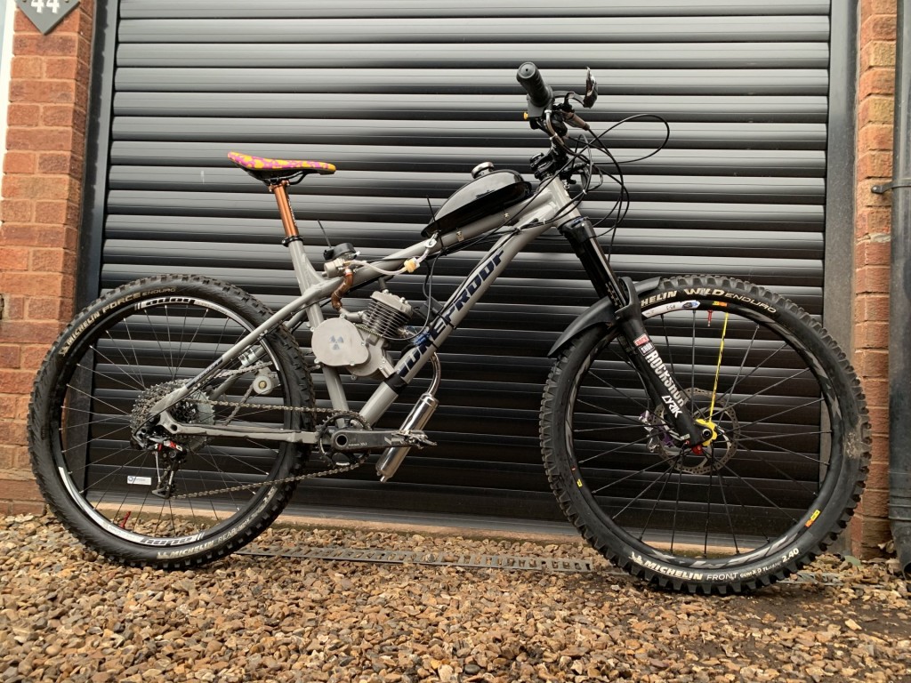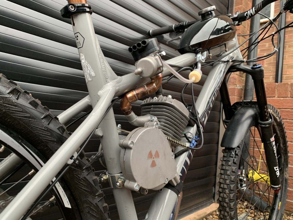 Designed and developed deep in the Black Country, UK. With over 3 months of tinkering, engineering and refining in the garden shed, it’s almost ready for the trails. Harnessing the power of an e-bike, but with technology from a lost generation technology, a 2-stroke 80cc engine 3bhp motor. As with a new bike, you’ve got to bring in a new standard, so we’re pleased to introduce ‘Super Mega Whopper Boost 168mm spacing (box ticked).