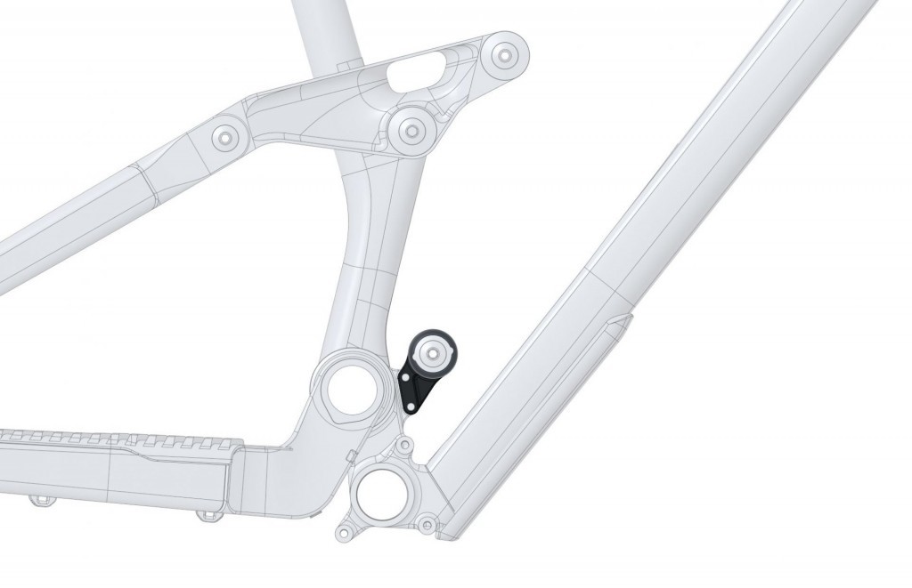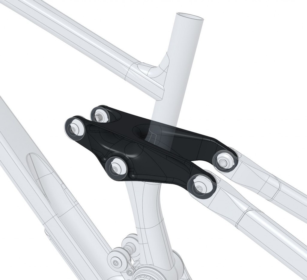 The rocker link has been reworked with cleaner surfaces throughout and, along with the new rocker pivot design, moves the bearings from the main frame into the rocker link. The new rocker pivot design also reduces some of the complexity from the main frame, improves force flow from the rocker link into the seat tube and reduces the potential for noises that can occur after long periods of use.