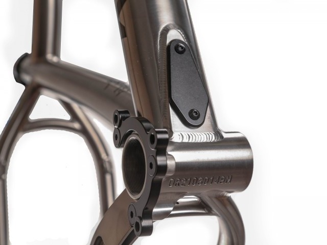 Steel and Titanium frames have a unique head tube shape designed to maximize strength to support forks up to 170mm. Tubesets flow into custom CNC machined dropouts, yokes and access ports (Titanium-only) so that stress risers are minimized. Even the included ISCG mount attaches cleanly into a recessed CNC machined pocket on the chainstay yoke.