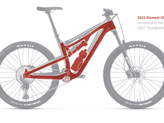Looking at the needs of shorter vs. taller riders, Rocky Mountain introduced a wheelsize split with their extra-small Element frame. The extra-small frame is offered with 27.5” wheel to help shorter riders with acceleration, and it also lowers the bike for a better fit and ride experience. The 2022 Element in extra-small has 33mm of increased standover against the 2021 Thunderbolt XS and 56mm vs 2021 Element size small.For riders that are tall enough to ride small, medium, large, or extra-large frames, the Element is available with 29” wheels.One of the goals with the new Element was to give more rider support across the range of travel but without giving up on rear wheel traction. The anti-squat was increased to offer quicker acceleration and reduced the end-stroke progression to make it easier to access the entire range of travel. This revised kinematic allows you to run less pressure and damping in your shock, leading to a smoother, calmer ride.