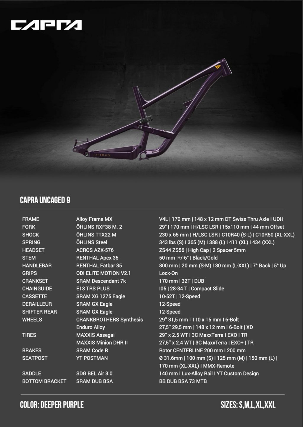 What do you get when you mix Swedish gold, a bit of goat, a dash of duck, and the color Deeper Purple? Once you wait for the smoke on the water to clear, you get the hardest-hitting Enduro riffs of all time – the CAPRA MX Uncaged 9 & the DECOY MX Uncaged 9. Boasting an Öhlins RXF38M.2 and TTX22m suspension package these MX hitters will be that little devil on your shoulder, encouraging more amplitude and speed on every trail. Hot off the heels of the previous LTD and Shred models these are unique concepts available now, however you won’t have to wait much longer for the full metal CAPRA Core 2 experience.