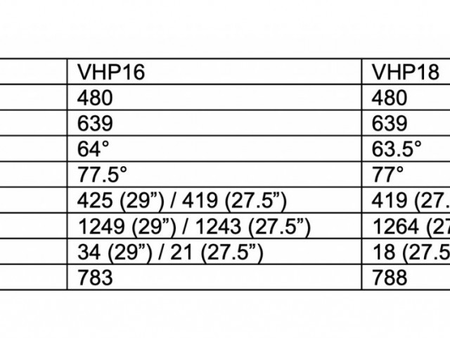How does the geometry of the VHP16 and VHP18 compare? The chart below shows the most important geometry numbers, based on a frame with 480 mm reach and 110 mm headtube. The VHP16 geometry is based on a 581 mm axle-to-crown fork and the VHP18 geometry is based on a 601 mm ATC fork (FOX 40 29” with 200mm).