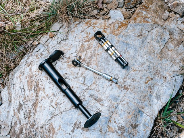 The ratchet and bits attach to a tool holder which lives inside a spring-loaded container that fits firmly inside the steerer—without the need to cut threads into the steerer.