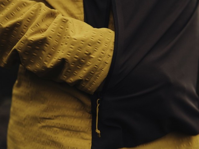 The two-part construction of WTV provides a high-density stretch woven outer face that acts as a wind regulator, backed by loft insulation with brushed yarns to capture warm air. In use, the trapped warmer air sits at higher pressure than the cooler air on the outside. This differential helps balance the system by pushing some of the warm air and moisture out.