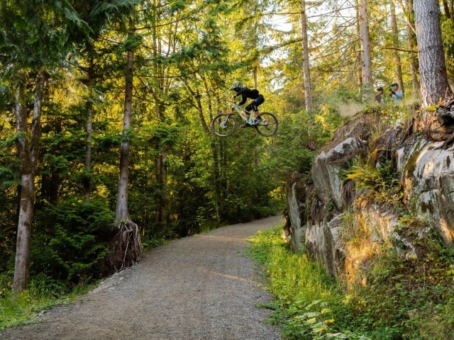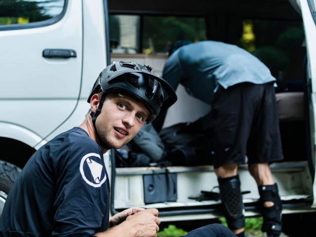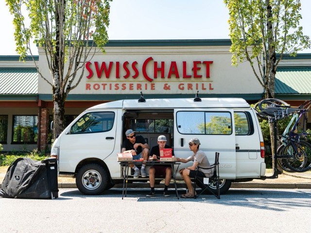 Fresh off the back of a harrowing 25-hour trans-Atlantic journey, the crew manages to co-ordinate a YVR pickup in their right-side drive van, affectionately dubbed “The Travel Mate.” Straight into the gnar, they brave the biggest rock roll the North Shore has to offer, which is apparently more akin to base jumping than mountain biking. The wildlife tour begins with a scabby racoon making eyes at Ludo, Thomas’ rear tire shows its true colors and Kasi soars above a road gap in the dying light.