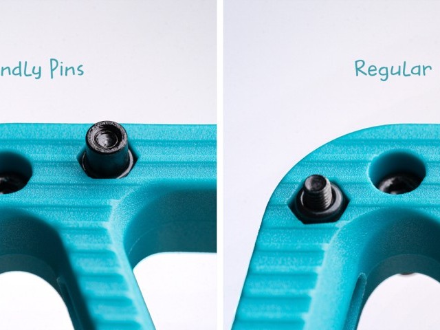 The Small Pedals have 7 steel pins per side and come with OneUp’s new Friendly Pins installed. The Friendly Pin is a threaded sleeve that covers a regular pedal pin (the same pins found on the full size Composite Pedal). For more grip, you can remove the Friendly Pin and leave the more aggressive threaded pin exposed.