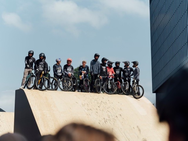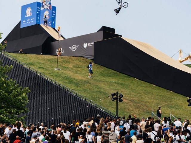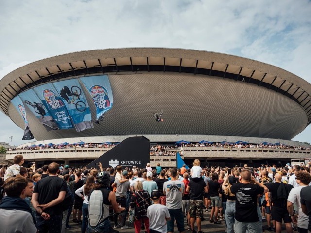 The athletes started on the roof of the International Conference Center in Katowice, before dropping 5-meters into three big kickers that were some of the biggest jumps of any FMB competition.