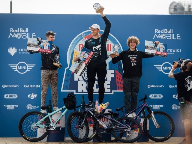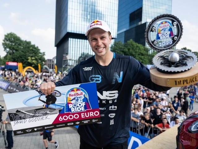 Slopestyle mountain bike athlete Dawid Godziek won Red Bull Roof Ride for the second successive time, defending his title in Katowice, Poland. The local Polish hero won with a score of 94.25 points at the FMB World Tour gold contest and landed a first-ever Cash Roll from a flat drop in the process.