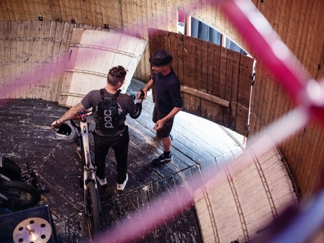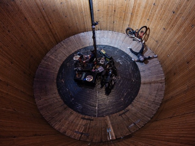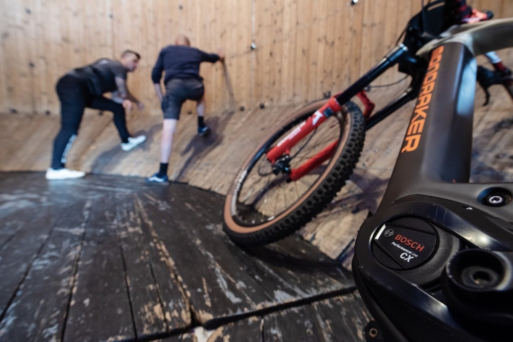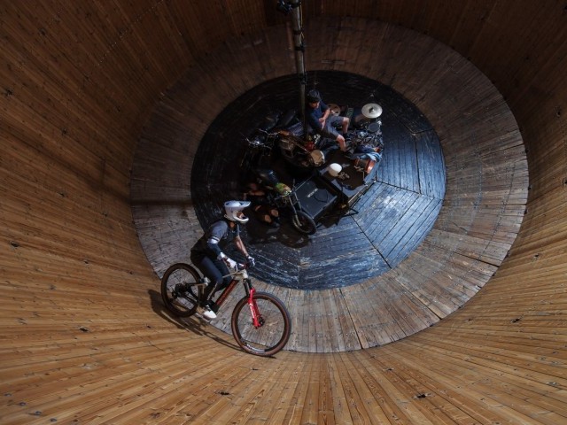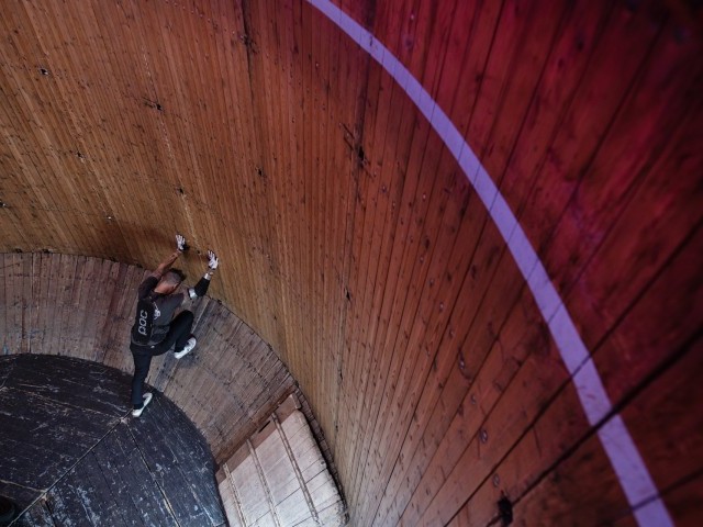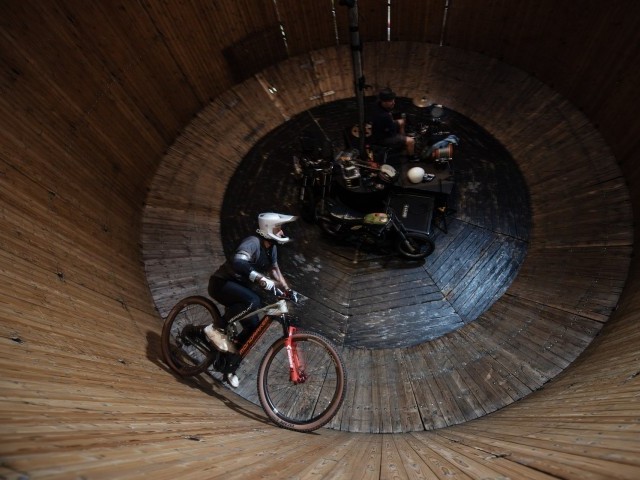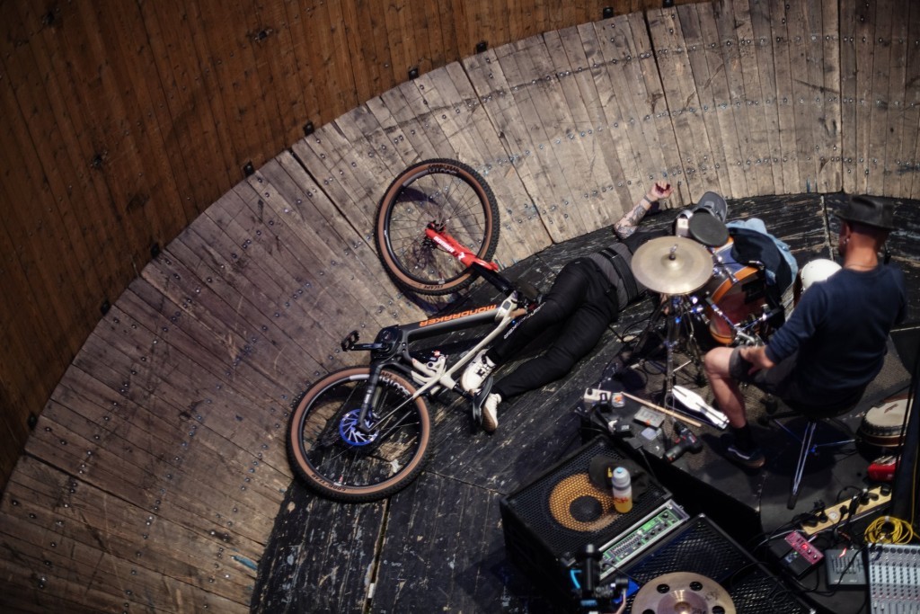 “The hardest thing was to switch the perception from horizontal to vertical. It’s a completely different perception of reality. The second challenge is the extremely slippery surface of the wooden walls. During one ride, my front wheel slipped, and I fell from three metres onto my back,” says the biker, who gained confidence and started routinely circling soon after several attempts. Moreover, constant pedalling made the ride very demanding in terms of balance as spinning the cranks challenged the rider’s stability every moment. There was also high-risk of hitting the pedal against the wooden wall when switching from horizontal to vertical ride.