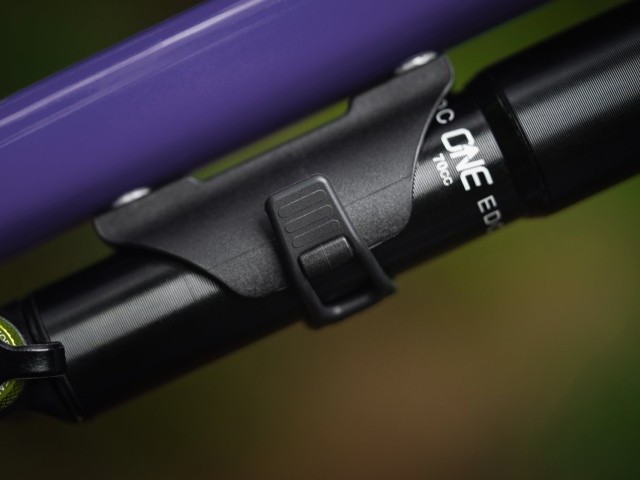 The EDC Inline Pump Mount hides the mighty EDC Pump loaded with a V2 EDC Tool under your top tube. The molded plastic mount and thick rubber strap keep the EDC Pump securely in place.