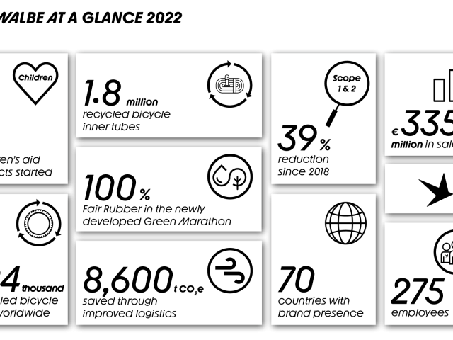 A milestone in 2022 was the presentation of the Schwalbe Recycling System. As a pioneer, the family-owned company is leading the way in recycling used inner tubes and tires. A new record was set with 1.8 million recycled bicycle inner tubes used to produce new ones worldwide. Schwalbe is the first and still the only tire manufacturer in the world to recycle used bicycle tires since July 2022, and in the first six months this figure was already 184,000 units. With this year‘s presentation of the Green Marathon, it has now even been possible to close the loop and present the world‘s first bicycle tire that was made from used tires, amongst other things.