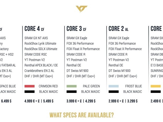 Core 4 steps the game up: At this level, you receive top-performance components, including RockShox Ultimate suspension, the latest Sram GX Transmission drivetrain, SRAM Code RSC brakes, Crankbrothers EN 2 AL wheels, and a YT-exclusive blacked-out Renthal Apex cockpit. Core 5 now sits at the top of the food chain. This dream build features YT’s highest-grade Ultra Modulus carbon fiber,