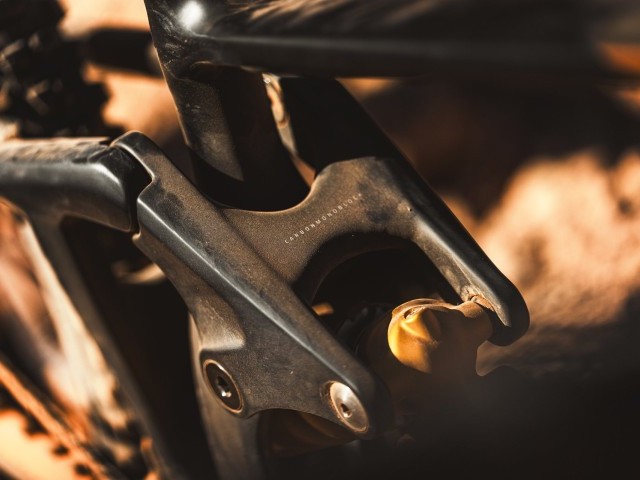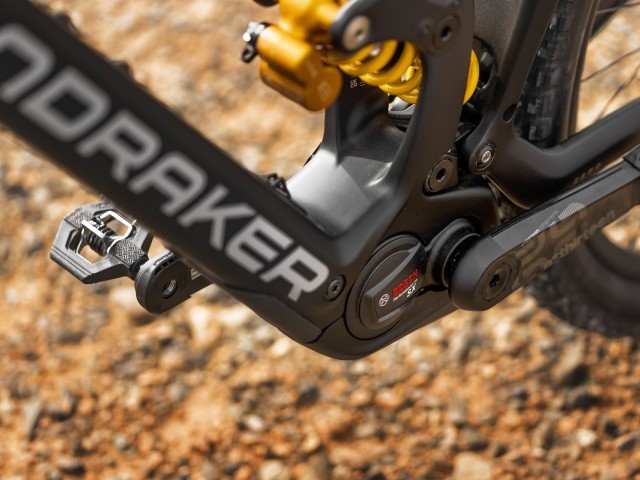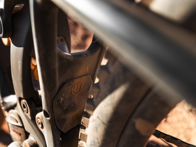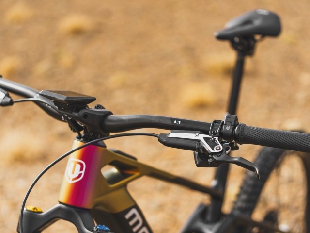 It also integrates a monobloc carbon-fibre rocker linkage, an under-toptube Fidlock support, motor bash-guard, a mudguard for the shock and custom-made moulded frame guards for the rear triangle.