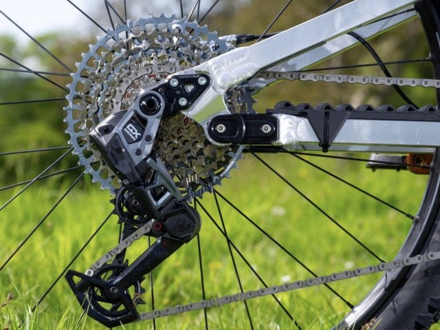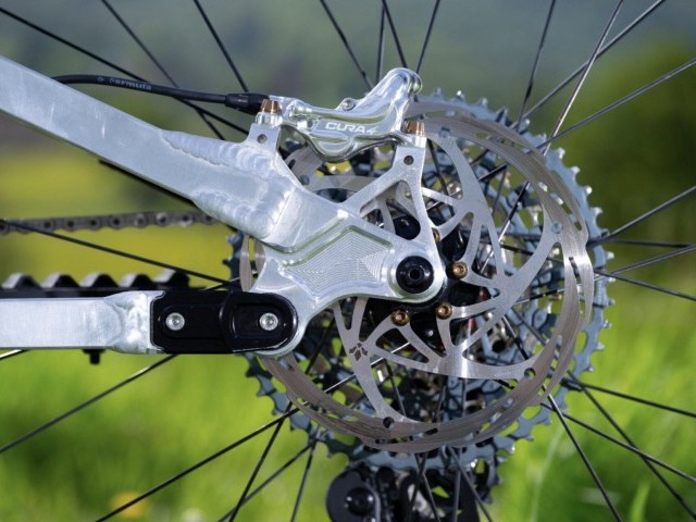 Adjustable, replaceable right-hand thru-axle mount for factory setting of exact toe and camber of the rear wheel. No crabbing here!
