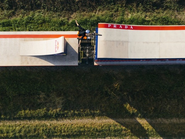 Dawid Godziek, the 2024 Slopestyle World Champion, has achieved a historic milestone in mountain biking: riding his bike on a moving train. In a world-first feat, created in collaboration with Prada Linea Rossa, Godziek navigated an unprecedented mountain bike course built on a speeding train, mastering 10 carriages at a speed of 23 km/h while executing some of the sport’s most electrifying tricks, all captured in a spectacular “freeze frame” effect.