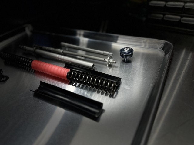 The topcaps for Fox, Ohlins and DVO forks are interchangeable between V1 and V2. The springs are also interchangeable; the longer-travel V2 fork kits include the secondary spring to pair with the primary spring – the primary spring is the only spring used at 170mm and below. You will need a stiffer primary spring when using the secondary spring as the combined rate is softer.
