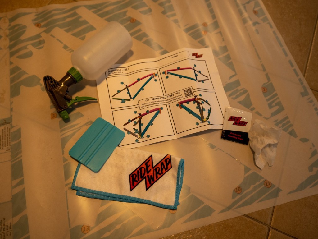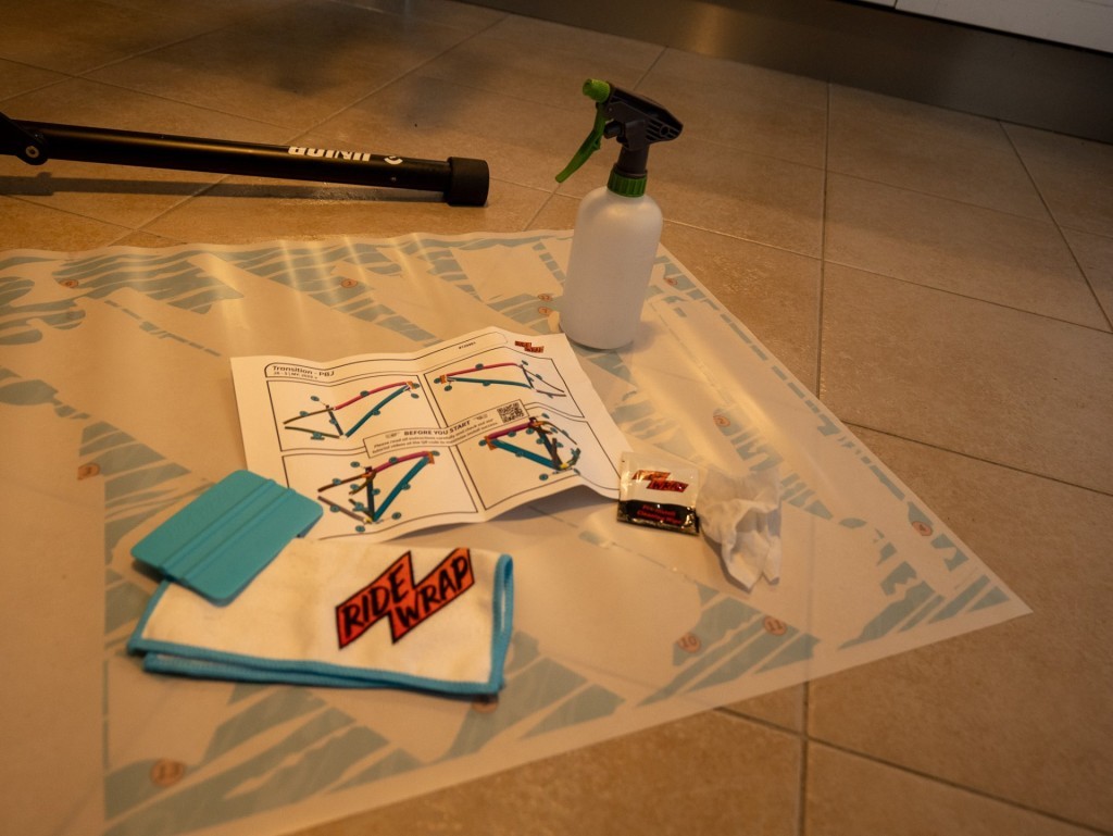 What helps as well is that Ride Wrap includes the most important tools for the job. A good quality microfiber cloth, a squidgee and the manual that has a clear order of which stickers go where. There is a nice build up too in difficulty if you follow their instructions. You start out with the easier and smaller stickers, and end with the big ones like down and top tube that can be a bit harder to get on in the first try.