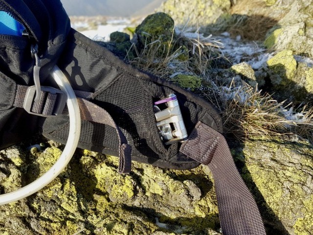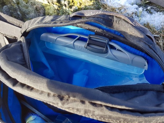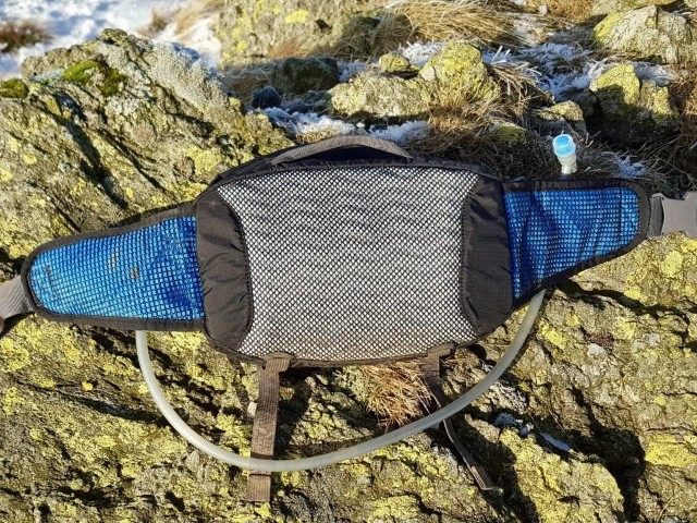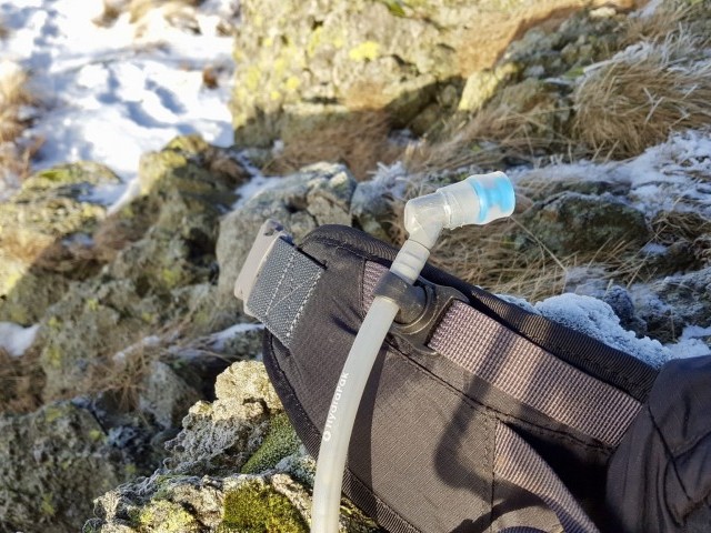 With this reduced load, the waist pack really came into its own, keeping weight low and my back slightly less sweaty. Even with less water in the bladder, the divider stops the slosh and prevents any undue movement. The bite valve, although located on the hip, works well. It takes a little adjustment, but soon becomes natural.