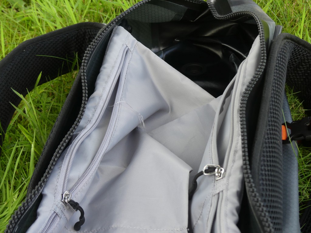 Filling the Atrack with kit is a pleasure as there is no hidden space as often found in rucksacks where half the volume is hidden in some narrow space or optimistic pockets on the outside of the pack. In this case, you can access the whole space with a simple zip, which allows for easy storage and even easier organisation. Use of small dry bags can help to keep it tidy, but you needn't worry about things getting wet, this thing is fully watertight.