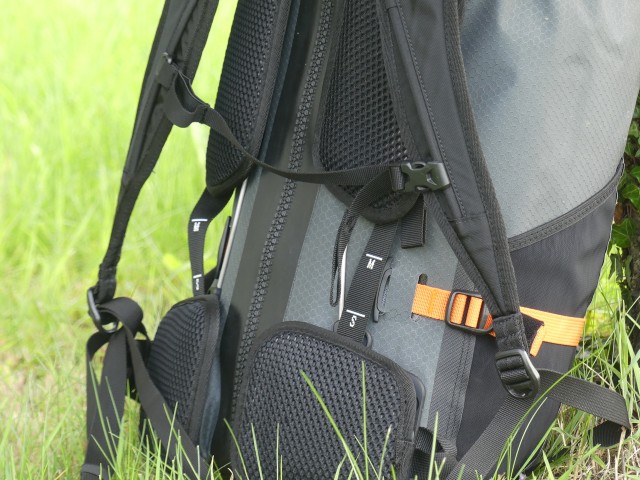 Externally the bag has a slim metal frame on which the shoulder straps can be slid up and down to fit various back sizes from small to extra large. There are two padded areas for the lower back, a chest strap and a rather minimal waist belt.