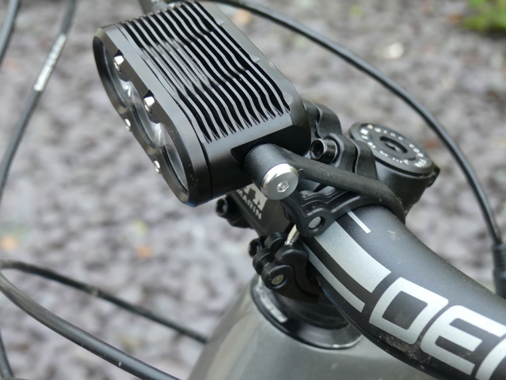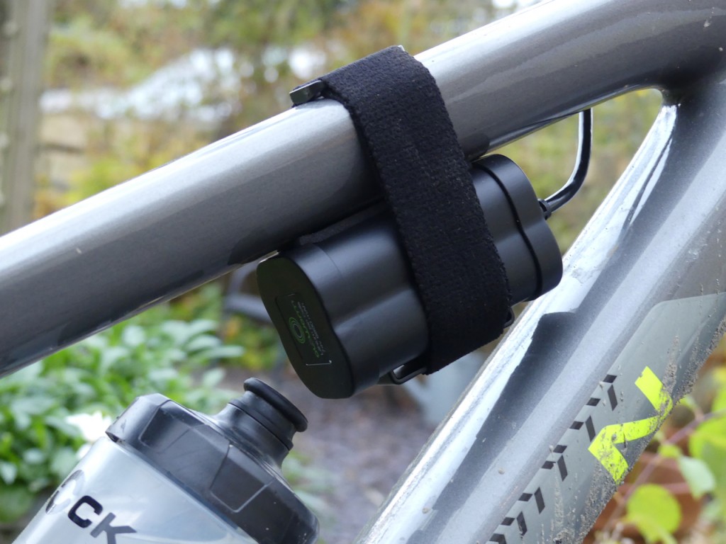 Despite the sheer number of parts that fall out of the box when first opened, installation is, in fact, simple and quick. Various straps and Go Pro mounts allow for attachment to bars or helmet in different orientations. For me, this was a bar-mounted light and as such, I used the quick release bar mount and a stretchy velcro strap to attach the battery to the top tube just behind the stem. The bar mount allows the light to sit low in front of the stem and be central on the bars, which looks cool and centralises the light source. It would, of course, be lovely to have the battery integrated into the light itself, which is possible from someone like Exposure, but the price takes a hike if you still want the full 3400 lumens. Ultimately once mounted, It makes very little difference to the overall riding experience.