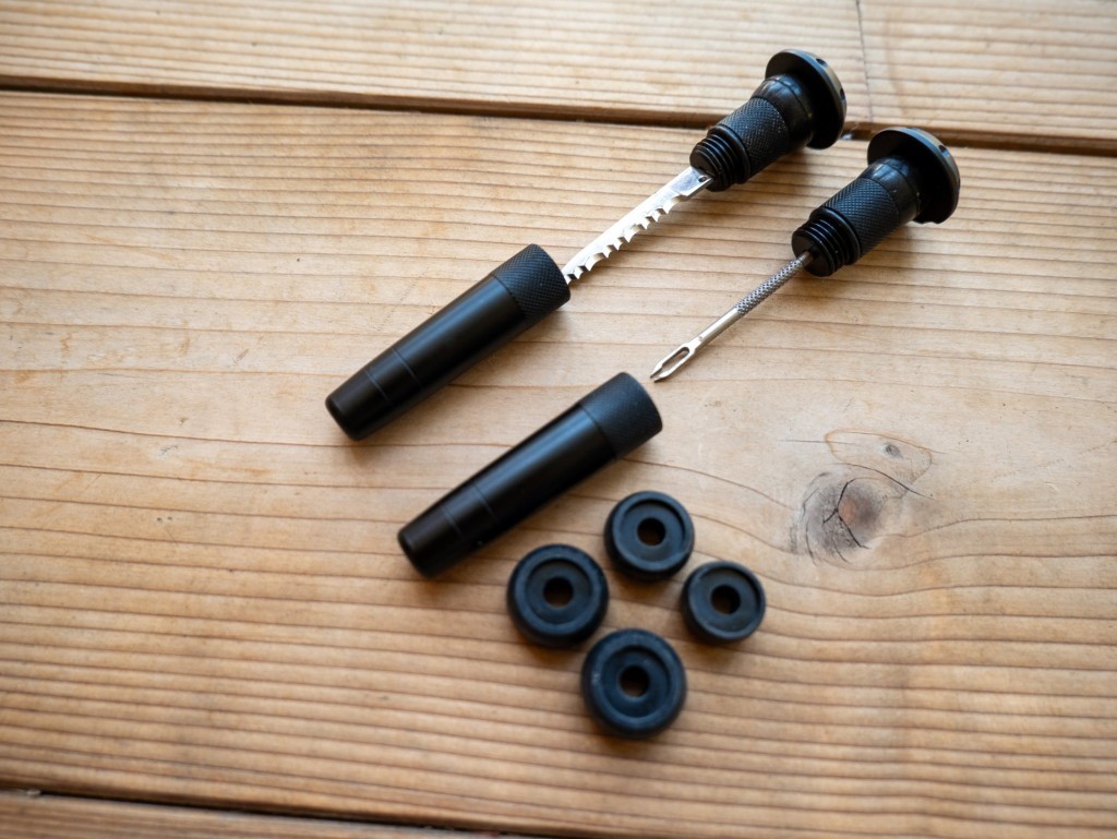 The Stealth Tubeless plug kit from MucOff is a clever tool that will save you if you have a puncture that can’t be sealed with just the sealant. Disguised as bar end plugs, the kit has a ‘jabber’ tool in one bar plug to help you put the ‘worm’ into the damaged tire and a knife tool in the other plug to cut off any excess plug.