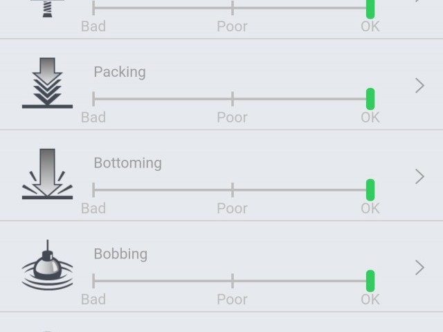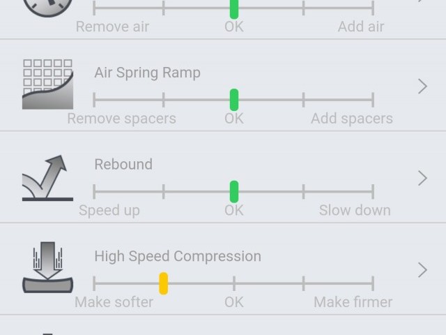 Moving through the app, there are then six different characteristics with sliders representing how to adjust these to improve the ride. Basic adjustments include air pressure and rebound, but also high and low-speed compression, air volume and bottom out resistance.